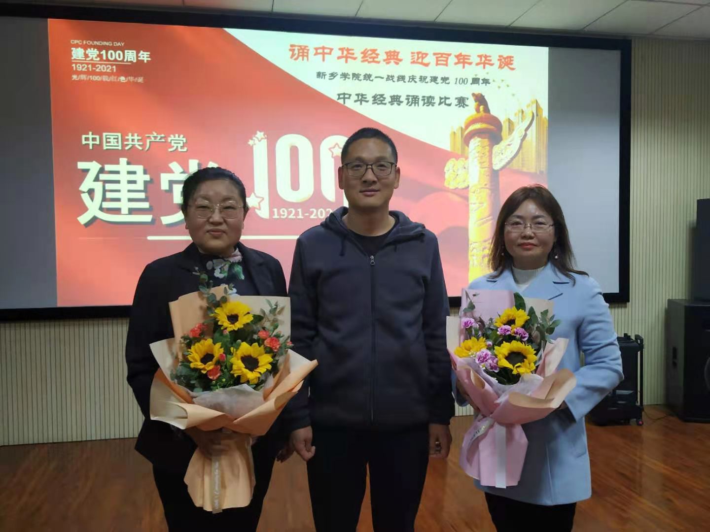 史鸿敏老师朗诵了舒婷的经典作品《致橡树》,王爱民老师朗诵了新乡市当代著名诗人张恒元的《共产党员》,两位老师优美的嗓音,饱满的情感与恰到好处的停顿与语调赢得了评委老师及现场观众的阵阵喝彩,表达了民主党派老师的拳拳爱国之心与对中国共产党的崇敬与爱戴。