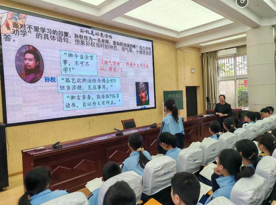 4月10日,专家组来到新蔡县今是中学进行跟踪指导,观摩袁春霞老师《孙权劝学》的公开课。省培专家周枫琳老师肯定了教师创设情境和运用信息教师手段赋能课堂教学的作用。针对本次教学,周老师指出可以基于人物出身背景和故事发生背景进行优化设计,可根据吕蒙出生于汝南郡,今天大概就是新蔡中学的周边这一真实情境进行教学设计,既有利于学生理解,也有利于课程思政开展;吕蒙出身背景的前期理解,也会驱动学生充分理解古文中人物对话的真正本质。省培专家崔丽老师指出:课堂教师提问过于碎片化,可以提出一个主问题,然后分设几个小问题的方式对整体教学进行结构化、逐层深入的教学设计。听评课后专家团队还与今是中学教师围绕新课标单元教学设计、教学梯度设置以及AI技术运用等议题展开了深入探讨。