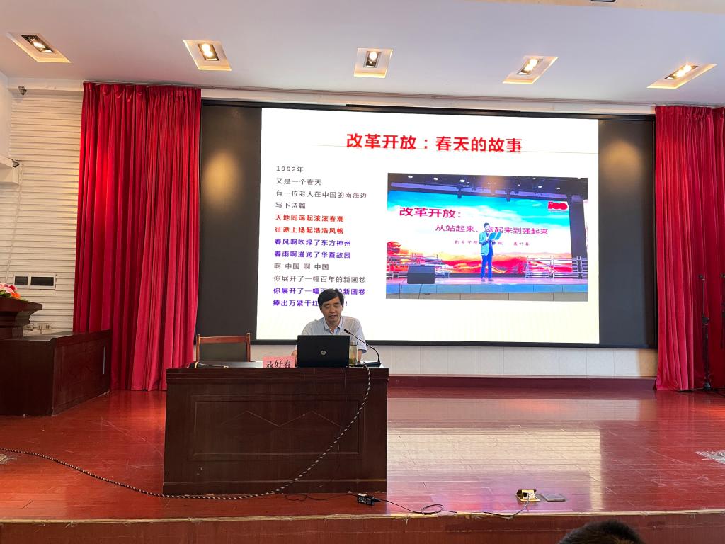 聂教授从“中外历史上的改革开放”、“毛泽东改革开放思想与实践”、“伟大的转折:党的十一届三中全会的召开”、“拨乱反正与起草历史决议科学评价毛泽东”、“习近平:推进更深层次、更高水平开放”五个方面向在座党员做了系统的讲解。聂好春教授的讲解深入浅出、生动有趣,他用大量的史实阐述了改革开放是实现中华民族伟大复兴的必由之路,突出了中国特色社会主义制度的优越性,指出中华民族伟大复兴梦必将在改革开放的进程中得以实现。他的精彩讲解吸引了在座听众,大家时而聚精会神地听讲,时而认真细致地笔记,时而会心点头赞许,完全沉浸在聂好春教授的精彩讲解中。