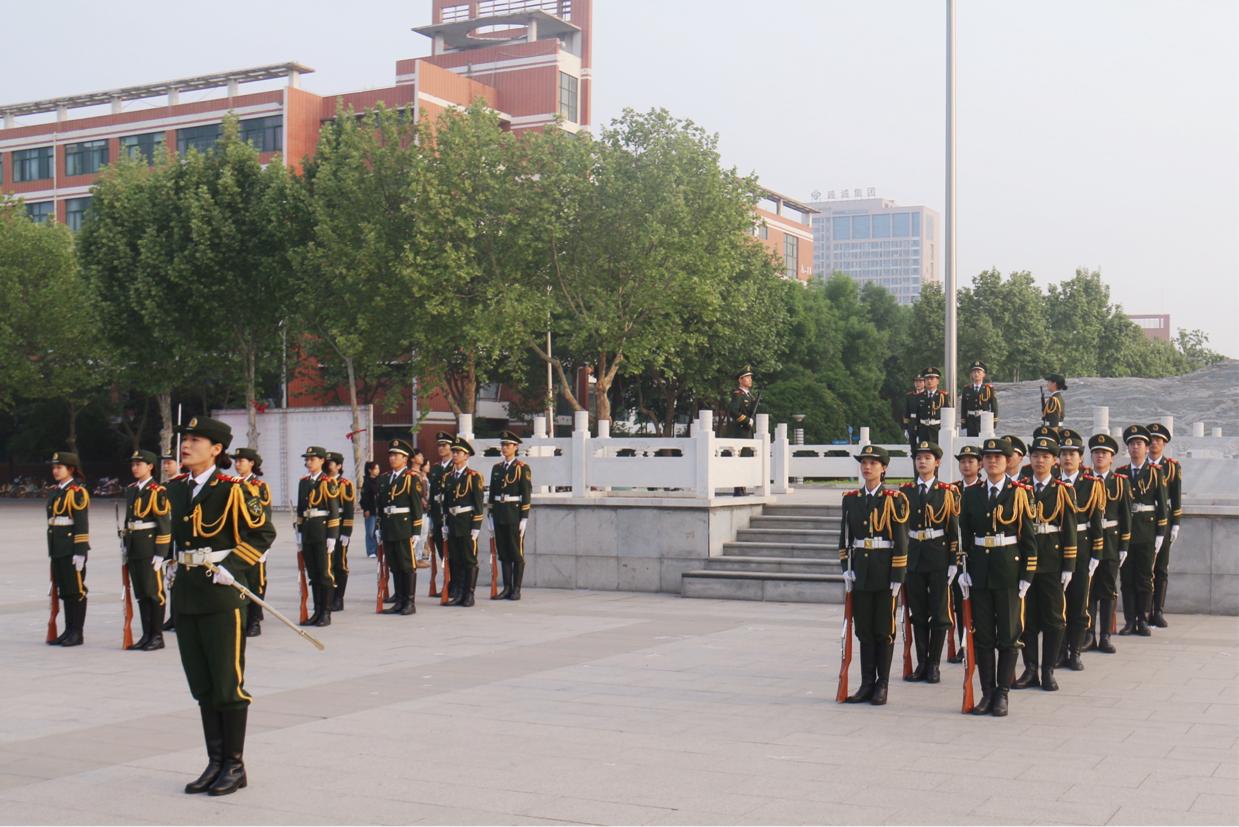 仪式伊始,伴随激情雄壮的音乐,国旗护卫队迈着激昂的步伐入场,庄重严肃地将国旗护送至升旗台,在响亮的国歌声中,五星红旗冉冉升起,高高飘扬,全体师生向国旗行注目礼。