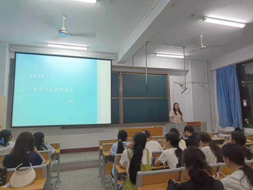 最后,2022级汉语言文学2班的李姣姣同学进行了“一名退伍女兵的自述”,讲述了她的精彩部队生活,分享了她的成长蜕变,并鼓励同学们要不断提高思想觉悟,积极投身我国国防事业的发展,将自己的远大抱负和满腔热血挥洒在绿色军营当中。