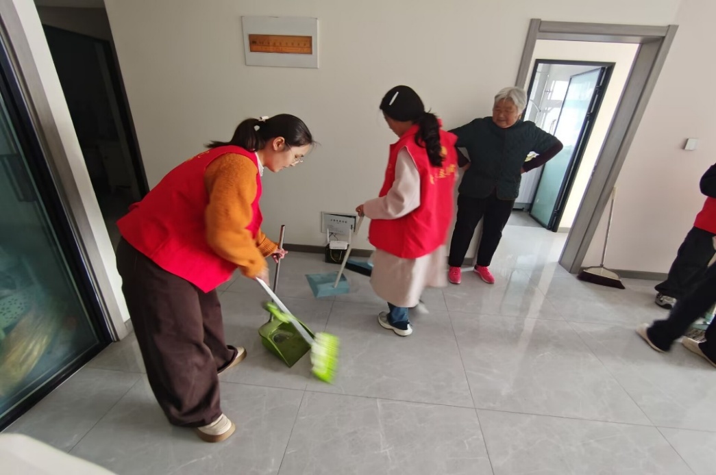 志愿者们分组行动,帮助社区老人清扫公共区域落叶、擦拭公共设施,并进入多位独居老人家中,协助整理房间、打扫卫生。随后,同学们围坐在老人身边,耐心倾听他们讲述人生经历、家庭故事,也分享自己在大学的学习生活与成长感悟。