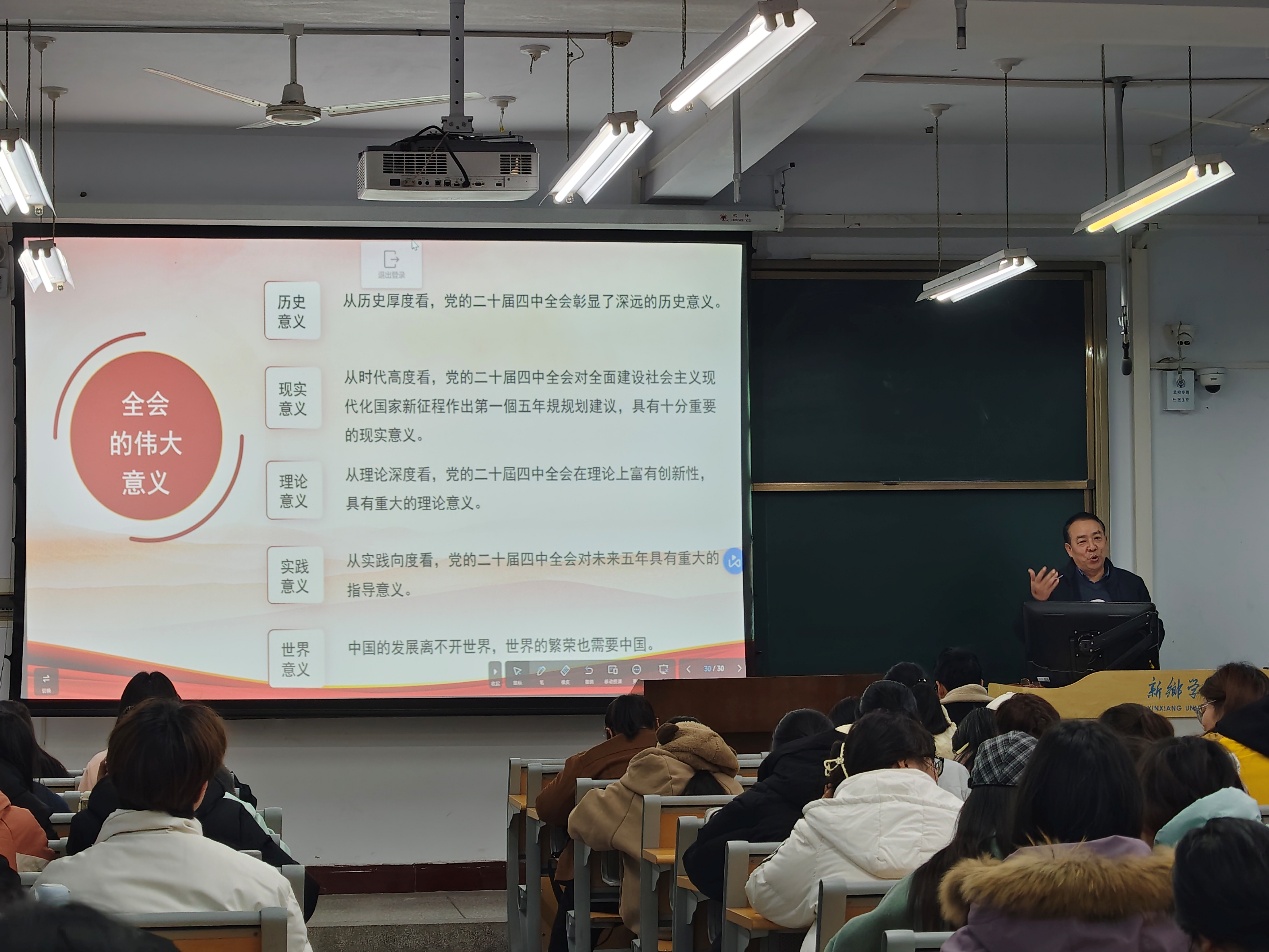 李金玉从“历史逻辑、现实需求、未来导向”阐释全会意义,指出全会《建议》中“教育科技人才”“文化发展”等部署与学院使命契合,并简要解读《建议》框架,结合学科明确实践方向,深化文化研究与传播,推进课程思政改革,围绕党的二十届四中全会的核心要义、精神实质与实践要求展开深入解读。他结合WilliamHill威廉希尔学科特色与发展实际,从“文化传承与创新”“基层党建与育人实效”“社会责任与使命担当”三个维度,阐述了如何将全会精神转化为推动学院发展、服务师生成长的具体行动。