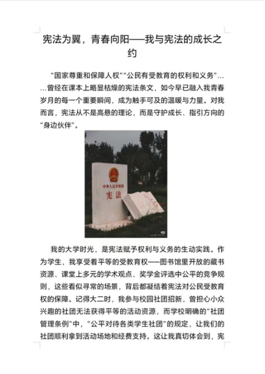 活动启动后,全院各班级学生积极响应、踊跃参与,纷纷以图文、视频等形式定格对宪法的理解与尊崇。在创作过程中,同学们跳出理论说教的框架,将宪法精神与校园生活、社会观察、个人成长紧密结合:有的以图文作品绘制宪法对青年权利的保障图谱,用生动笔触展现宪法与日常学习生活的紧密关联;有的通过心得随笔与影像叙事结合的方式,分享自身在学法、懂法、用法过程中的成长与蜕变。作品内容兼具思想深度与情感温度,既体现了青年学子对宪法内涵的深刻领悟,也展现了新时代青年尊法、信法、守法、用法的自觉意识。