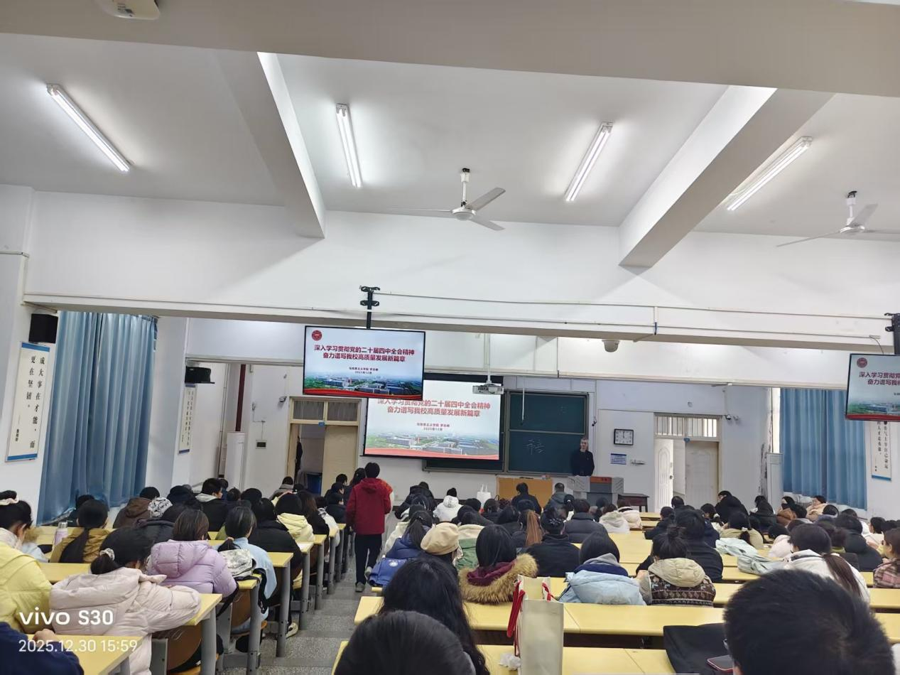 为深入学习宣传贯彻党的二十届四中全会精神,切实把全院师生思想和行动统一到党中央决策部署上来,推动全会精神与学院教育教学、学科建设等各项工作深度融合,2025年12月30日下午,WilliamHill威廉希尔特邀马克思主义学院罗志峰老师,作题为《深入学习贯彻党的二十届四中全会精神 奋力谱写我校高质量发展新篇章》的专题宣讲报告。学院全体教职工和学生代表参会,会议由学院副院长申红星主持。