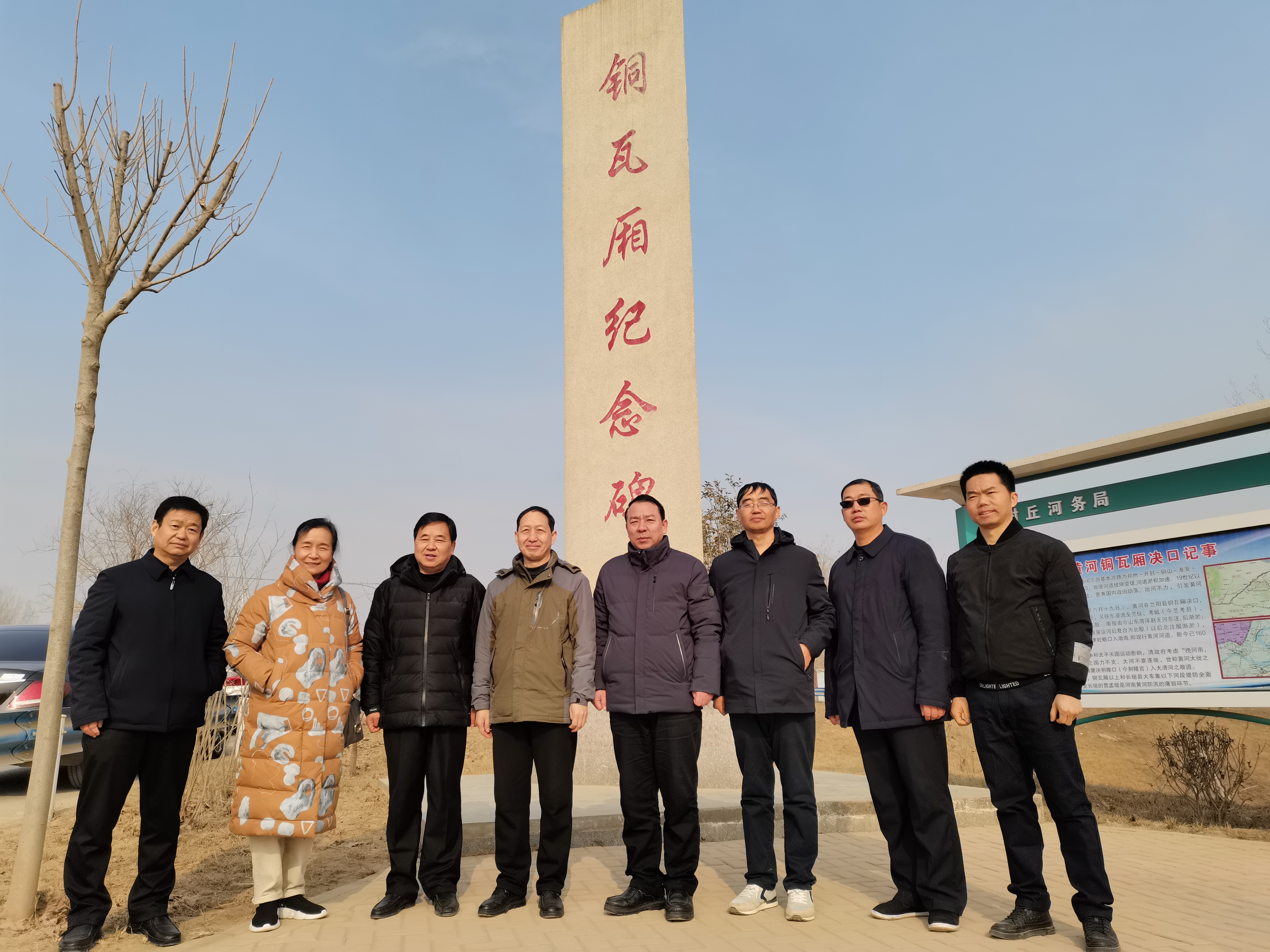 调研团队在封丘县文旅局局长封立昌的陪同下分别前往河南省文物保护单位青堆遗址、陈桥驿、铜瓦厢黄河决口纪念地、黄河曹岗险工、古黄池会盟台等处进行实地考察,对封丘黄河文化类型展开深入的研讨。尤其是在铜瓦厢黄河决口纪念地,封丘县河务局局长向大家详细介绍了清咸丰五年(1855年)铜瓦厢黄河决口改道的历史事件,自此次改道后,黄河由东南流向向北改道改道形成由山东注入渤海,从而结束了七百多年黄河东南流的历史。黄河在此转过最后一道弯,南北横贯直冲大堤,形成了“悬河”曹岗险工,“悬河”落差为13.95米,为黄河全段北侧落差最大处,可开发黄河水域面积达30平方公里。