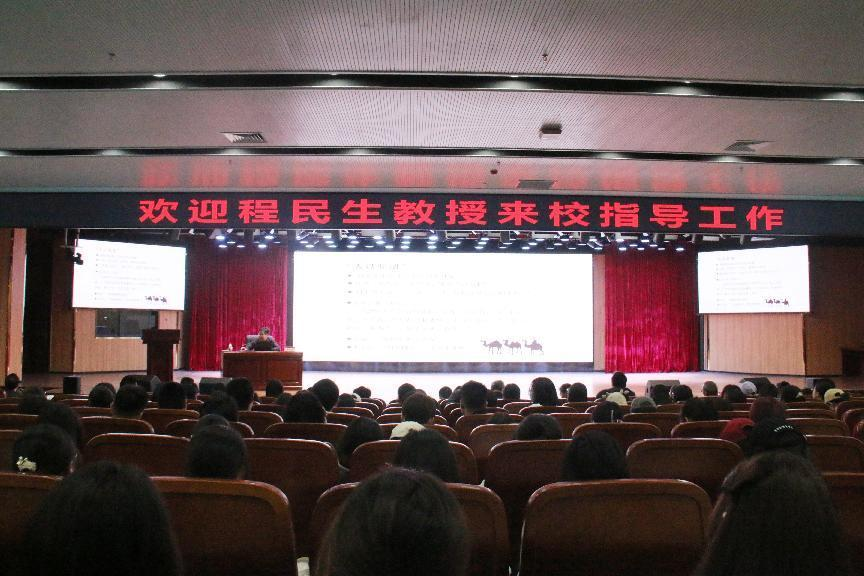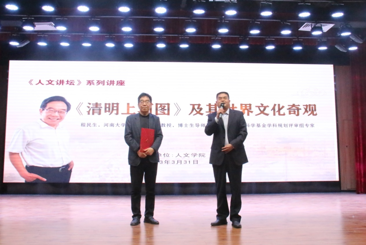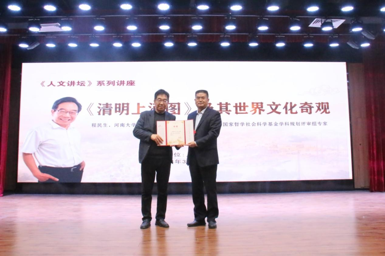 授聘仪式结束后,程民生教授为师生作了题为《〈清明上河图〉及其世界文化奇观》专题报告。他从《清明上河图》的创作背景和年代、流传与展览、国内外影响等方面做了讲述。重点介绍了这幅图画背后的种种文化奇观及其所促生的文化产业盛况。并结合画中的驼队等细节,追溯还原了北宋都城风貌。程教授指出,《清明上河图》独一无二的影响,无与伦比的效益,使它不再仅仅是一幅画,它早已成为一个文化符号,一种社会现象,一种精神向往。这一千年文脉的奇迹贯通古今,最大限度地弘扬了中华文明。《清明上河图》是中国的世界梦!更是世界的未来梦!