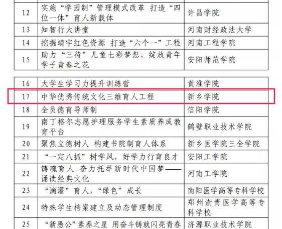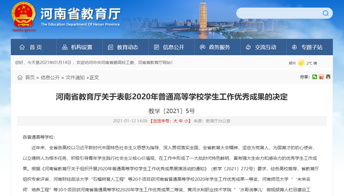 近日,河南省教育厅下发《关于表彰2020年普通高等学校学生工作优秀成果的决定》(教学〔2021〕5号),我院“中华优秀传统文化三维育人工程”项目在2020年河南省普通高等学校学生工作优秀成果评比中荣获二等奖。