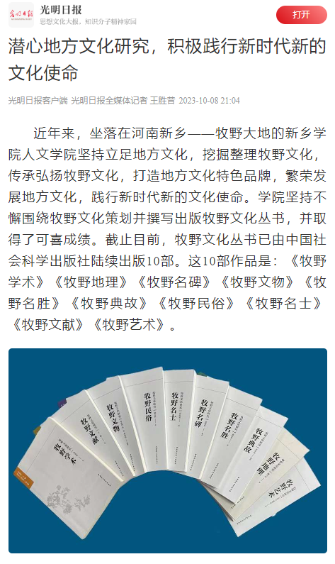 10月8日,光明日报客户端发布题为“潜心地方文化研究,积极践行新时代新的文化使命”文章,对我院牧野文化丛书编撰取得的成绩等进行了详细报道。全文如下: